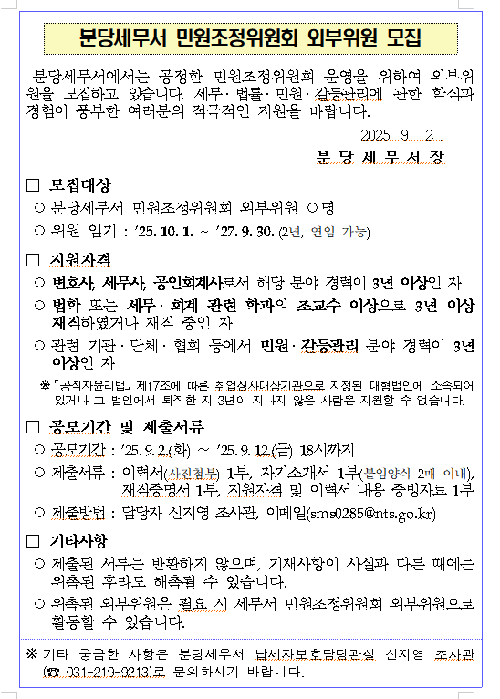 분당세무서 납세자보호위원회 민간위원 공개 모집