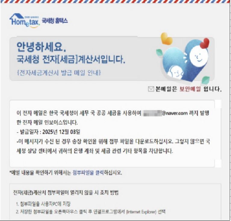 최근 국세청을 사칭하여 ‘전자세금계산서 발급 메일 안내’라는 제목의 메일이 발송되어 첨부파일 다운로드를 유도하는 사례가 발생하고있으니,