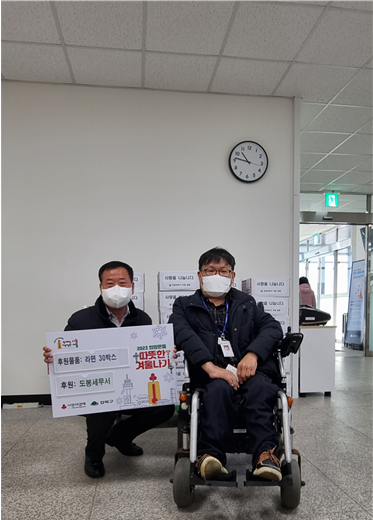 도봉세무서(서장 최종열)는 2023년 희망온돌 따뜻한 겨울나기 행사로 삼양동 주민센터를 방문하여 후원물품을 전달하였습니다. 이날은 추운 겨울 어려운 이웃들에게 라면 30박스를 전달하여 따뜻한 온정을 나누었습니다. 도봉세무서는 앞으로도 지역주민을 위한 사회공헌활동을 계속해나가겠습니다.