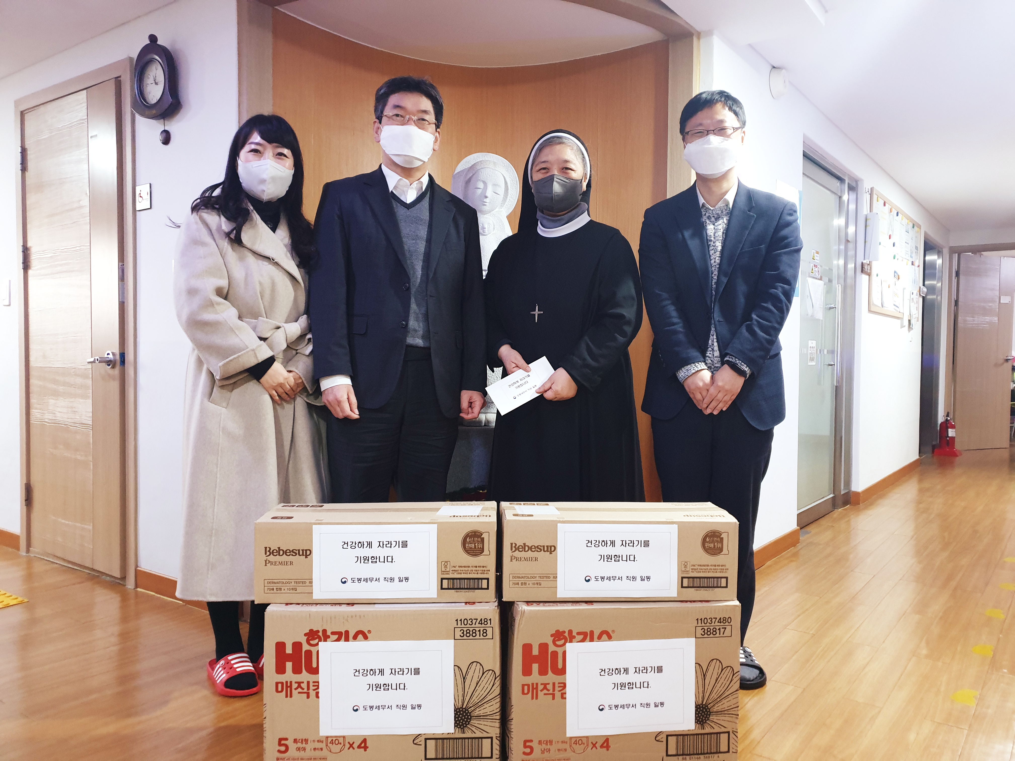 도봉세무서(서장 최종열)는 2023년 1월 18일 수요일 설 명절을 맞이하여 강북구 수유동에 위치한 장애영유아 거주시설 <디딤자리(원장 박상화)>에 후원금과 후원물품을 전달하고 이웃사랑 나눔활동에 참여하였습니다. 코로나19 감염증 확산 방지를 위해 별도의 행사 없이 전달식만 진행하였습니다. 앞으로도 지속적인 사회공헌 활동을 통해 사회적 책임을 다하고 어려운 이웃과 함께하는 도봉세무서가 되겠습니다.