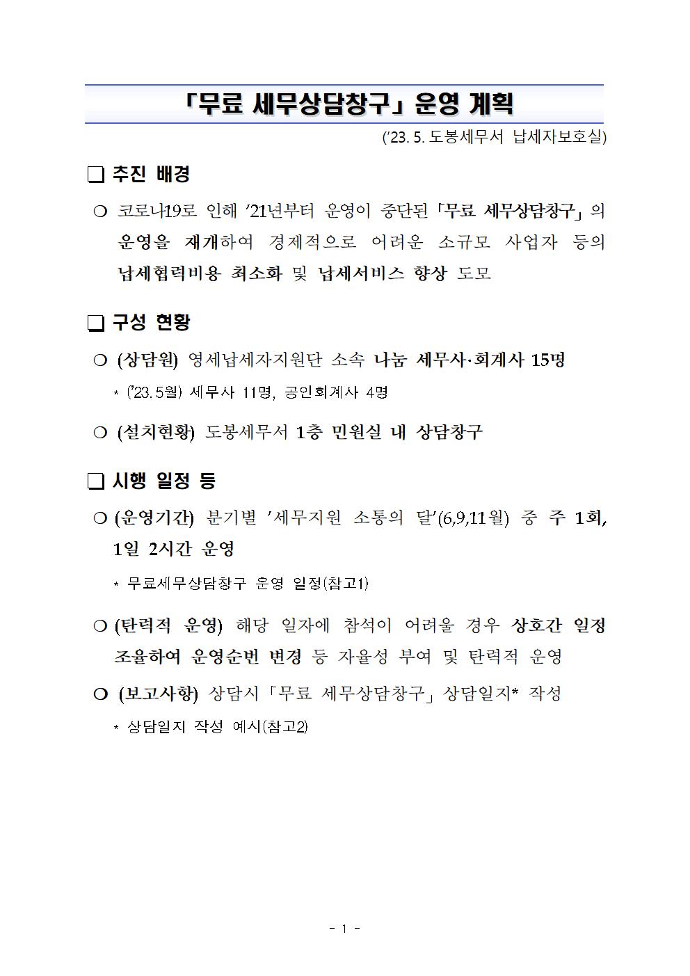 무료 세무상담 창구 운영계획