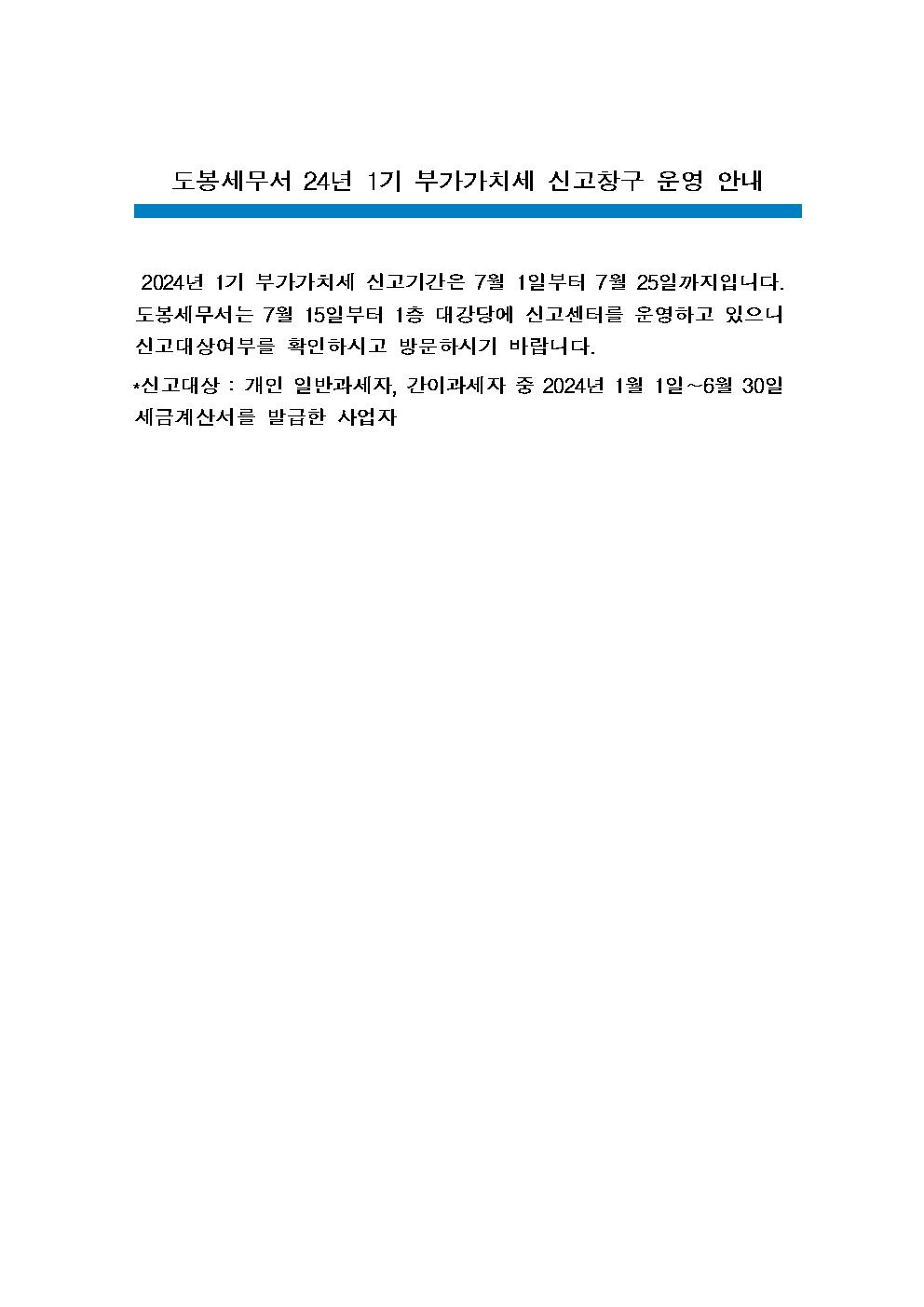 2024년 1기 부가가치세 신고기간은 7월 1일부터 7월 25일까지입니다. 도봉세무서는 7월 15일부터 1층 대강당에 신고센터를 운영하고 있으니 신고대상여부를 확인하시고 방문하시기 바랍니다. *신고대상 : 개인 일반과세자, 간이과세자 중 2024년 1월 1일∼6월 30일 세금계산서를 발급한 사업자