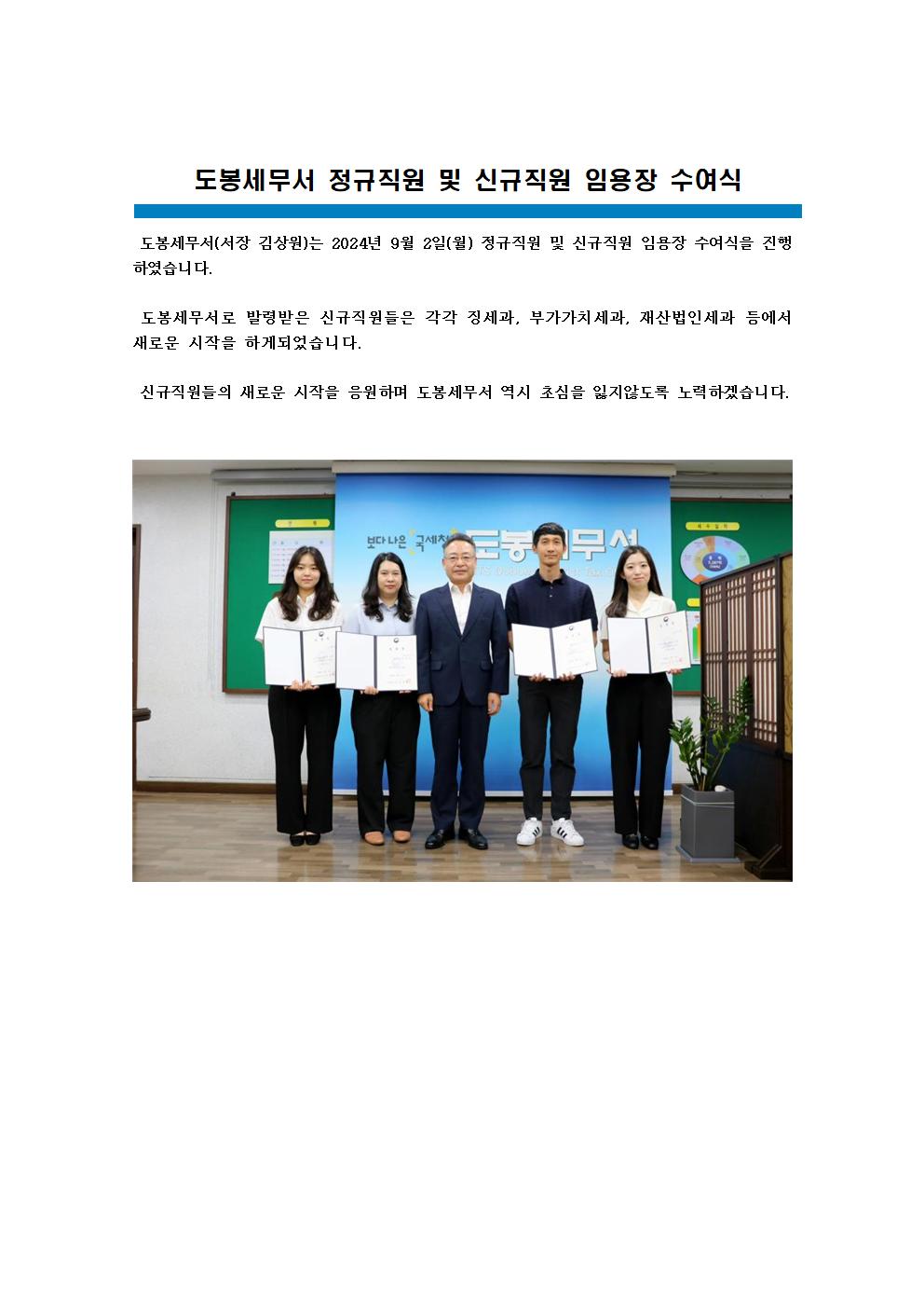 도봉세무서(서장 김상원)는 2024년 9월 2일(월) 신규직원 임용장 수여식을 진행하였습니다. 도봉세무서로 발령받은 신규직원들은 각각 징세과, 부가가치세과, 재산법인세과 등에서 새로운 시작을 하게되었습니다. 신규직원들의 새로운 시작을 응원하며 도봉세무서 역시 초심을 잃지않도록 노력하겠습니다.
