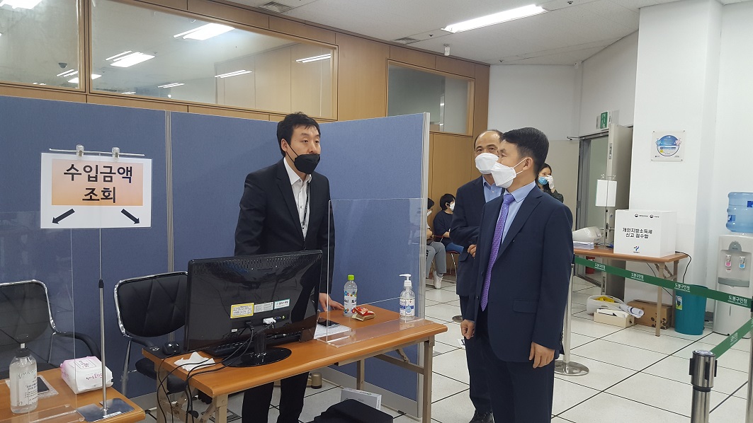 고현호 도봉세무서장은 지난 14일 도봉구청, 18일 강북구청을 방문하여 소득세 통합신고창구의 운영 현황을 살펴보았습니다. 고현호 서장은 창구를 둘러보며 새로운 제도의 시행과 코로나19 비상대응체제로 인하여 쉽지 않은 근무상황임에도 성실히 자신들의 역할을 수행하는 직원들을 격려하였습니다. 또한 남은 신고기간 중에도 납세자들이 불편을 겪지 않도록 최선을 다 해줄 것을 당부하였습니다.