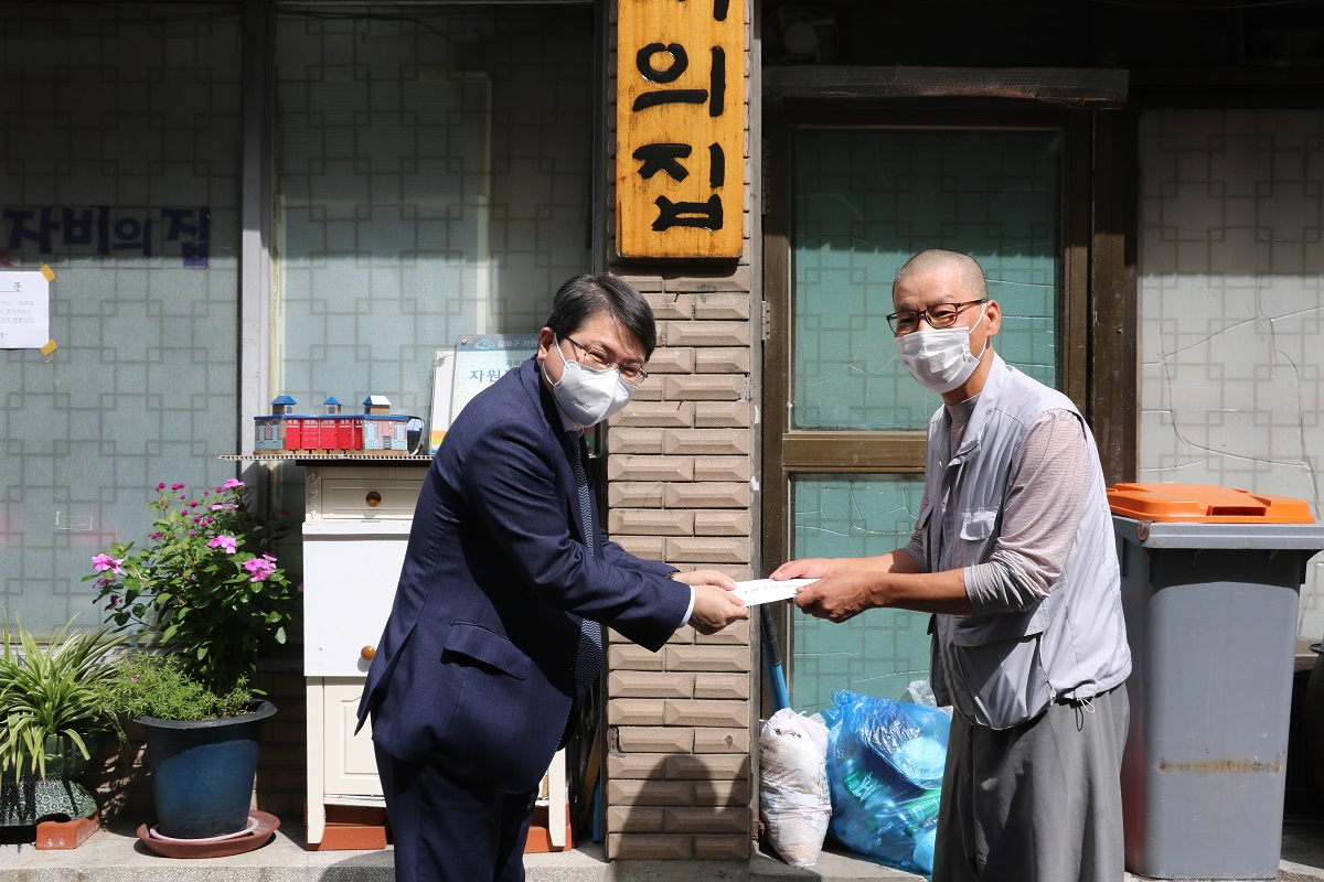 도봉세무서(서장 권순재)는 2020년 9월 24일 강북구 미아동에 위치한 무료급식소 '자비의 집'을 방문하여 직원들이 모은 위문금을 전달하고 종사자들을 격려하였습니다.