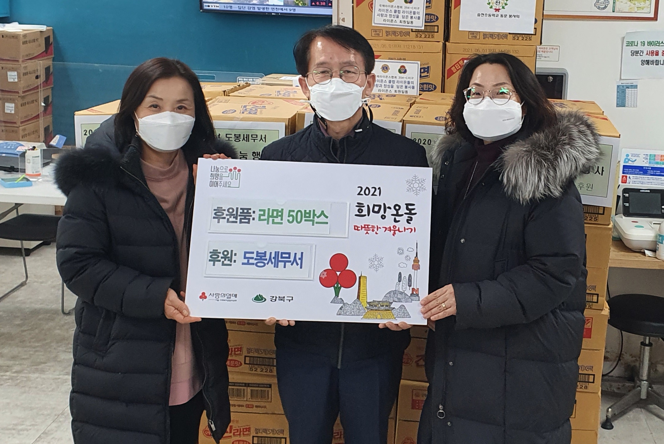 이날 봉사활동은 코로나19 감염증 예방을 위하여 별도의 행사 없이 전달식만 진행되었으며, 추운 겨울 어려운 이웃들을 위한 라면 50박스를 삼양동 주민센터에 전달하였습니다.