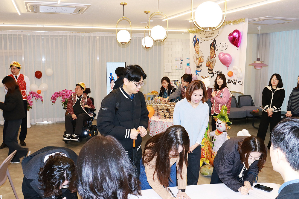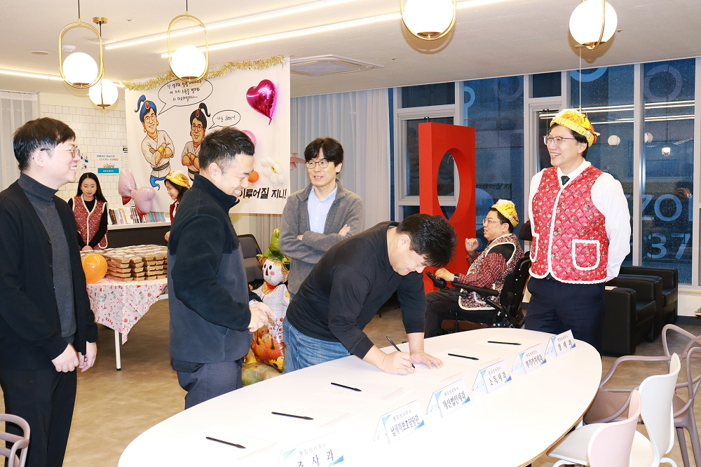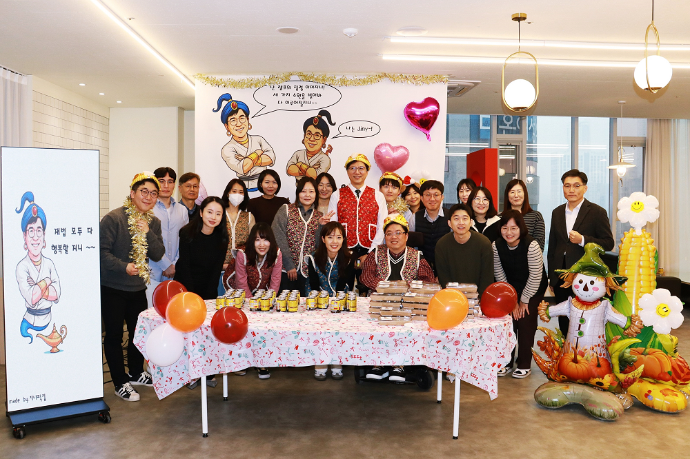 올 겨울 핫템 김장조끼를 입은 재산법인세과 직원들이 최근 흥행한 드라마 「다 이루어질 지니」 컨셉과 함께 연말 분위기로 직원 휴게실을 꾸미고, 봉사해준 덕분에 비 오는 축축한 아침을 활기차고 경쾌하게 시작할 수 있었습니다.