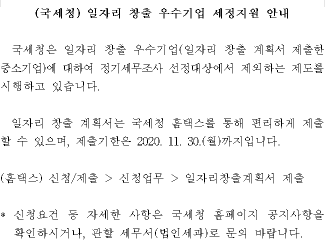 (국세청) 일자리 창출 우수기업 세정지원 안내
