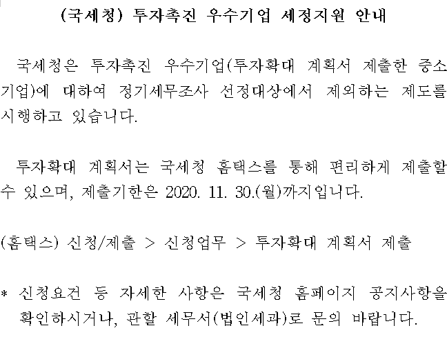 (국세청) 투자촉진 우수기업 세정지원 안내