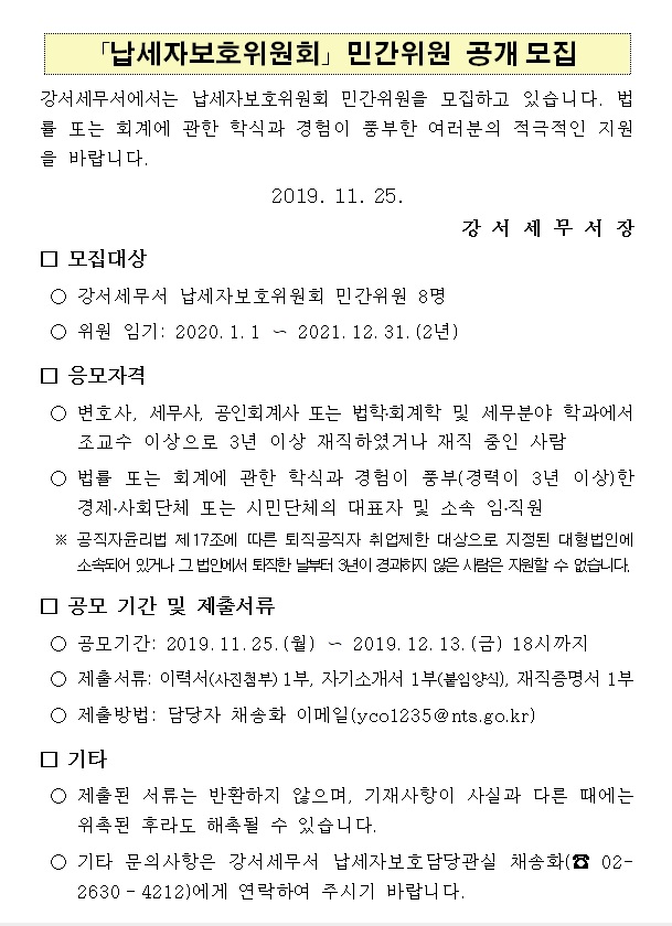 납세자보호위원회 민간위원 공개모집