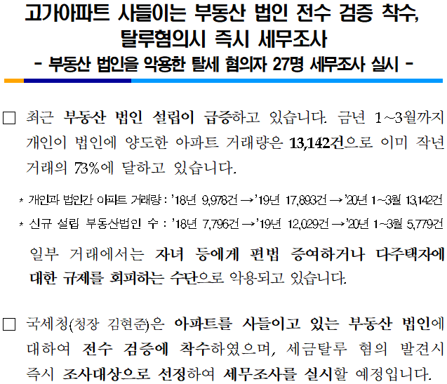 고가아파트 사들이는 부동산 법인 전수 검증 착수, 탈루혐의시 즉시 세무조사