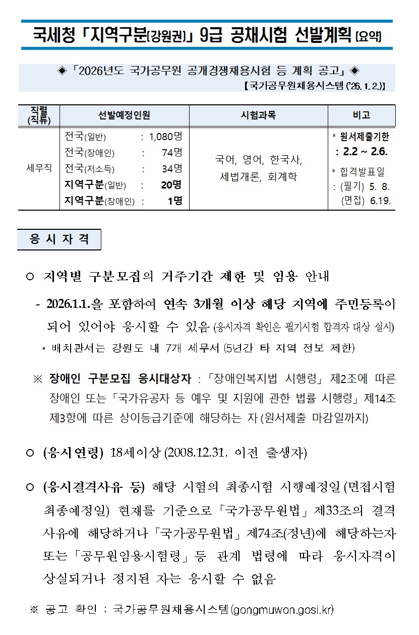 국세청 지역구분(강원권) 공채시험 선발 계획