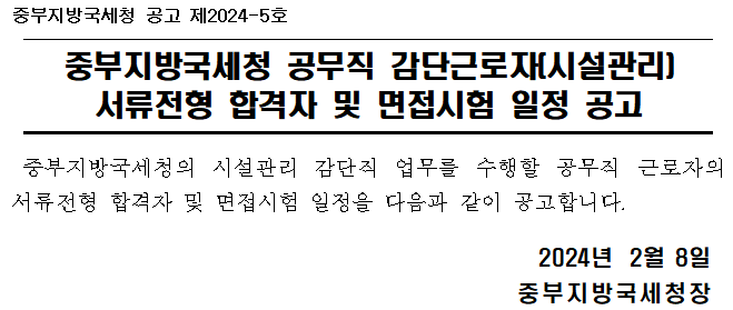 중부지방국세청 공고 제2024-5호 중부지방국세청 공무직 감단근로자(시설관리) 서류전형 합격자 및 면접시험 일정 공고 중부지방국세청의 시설관리 감단직 업무를 수행할 공무직 근로자의 서류전형 합격자 및 면접시험 일정을 다음과 같이 공고합니다. 2024년 2월 8일 중부지방국세청장