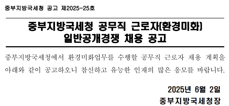 중부지방국세청 공무직 근로자(환경미화) 일반공개경쟁 채용 공고