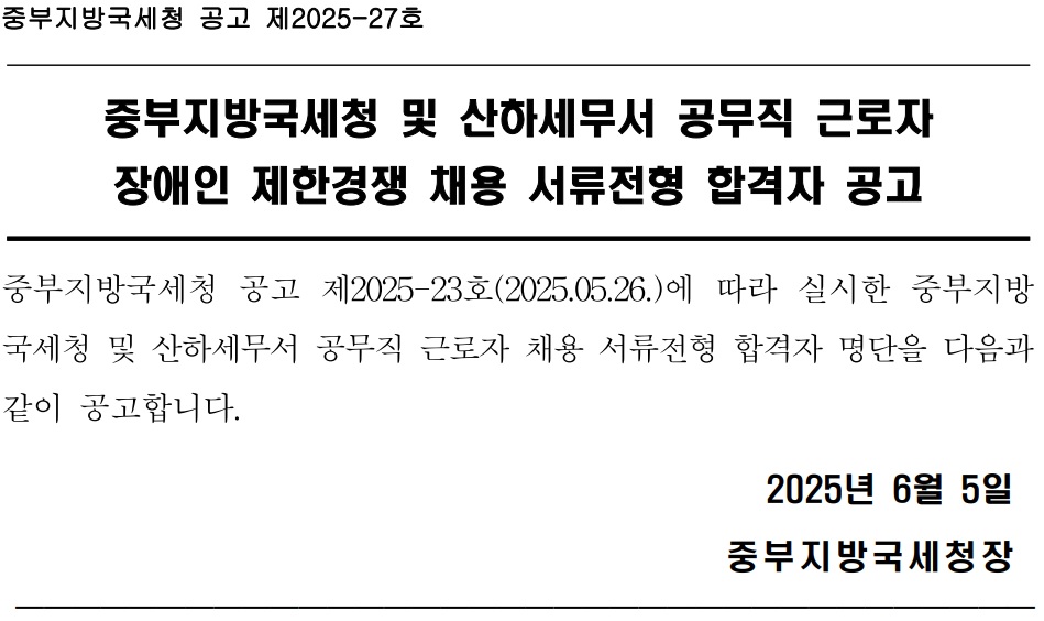 중부지방국세청 공고 제2025-27호 중부지방국세청 및 산하세무서 공무직 근로자 장애인 제한경쟁(2차) 채용 서류전형 합격자 공고 중부지방국세청 공고 제2025-23호(2025.05.26.)에 따라 실시한 중부지방국세청 및 산하세무서 공무직 근로자 채용 서류전형 합격자 명단을 다음과 같이 공고합니다. 2025년 6월 5일 중부지방국세청장