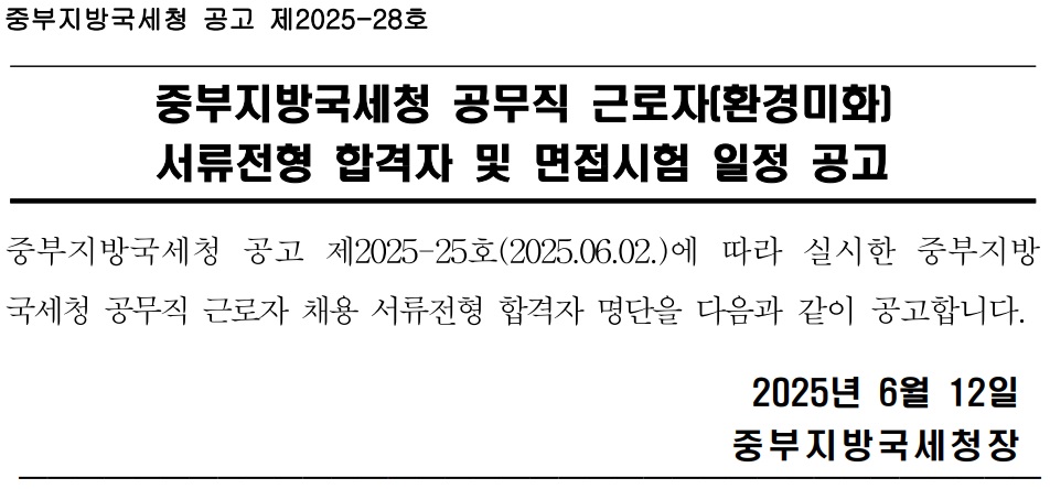 중부지방국세청 공고 제2025-28호 중부지방국세청 공무직 근로자(환경미화) 서류전형 합격자 및 면접시험 일정 공고 중부지방국세청 공고 제2025-25호(2025.06.02.)에 따라 실시한 중부지방국세청 공무직 근로자 채용 서류전형 합격자 명단을 다음과 같이 공고합니다. 2025년 6월 12일 중부지방국세청장