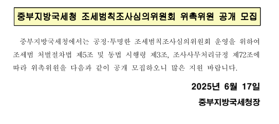 중부지방국세청 조세범칙조사심의위원회 위촉위원 공개 모집 중부지방국세청에서는 공정·투명한 조세범칙조사심의위원회 운영을 위하여 조세범 처벌절차법 제5조 및 동법 시행령 제3조, 조사사무처리규정 제72조에 따라 위촉위원을 다음과 같이 공개 모집하오니 많은 지원 바랍니다 2025년 6월 17일 중부지방국세청