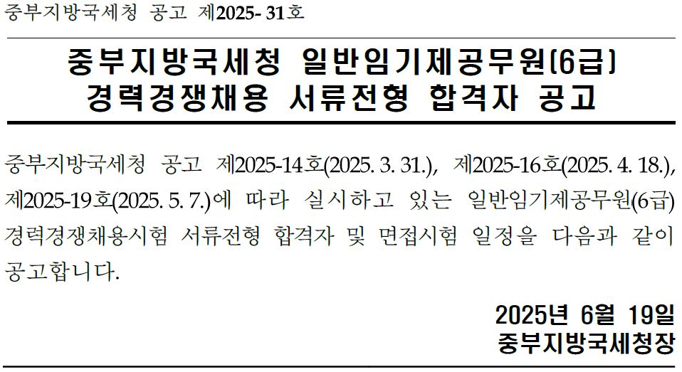 중부지방국세청 공고 제2025-31호 중부지방국세청 일반임기제공무원(6급) 경력경쟁채용 서류전형 합격자 공고 중부지방국세청 공고 제2025-14호(2025.3.31.), 제2025-16호(2025.4.18.), 제2025-19호(2025.5.7.)에 따라 실시하고 있는 일반임기제공무원(6급) 경력경쟁채용시험 서류전형 합격자 및 면접시험 일정을 다음과 같이 공고합니다. 2025년 6월 19일 중부지방국세청장