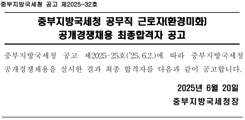 중부지방국세청 공고 제2025-32호 중부지방국세청 공무직 근로자(환경미화) 공개경쟁채용 최종합격자 공고 중부지방국세청 공고 제2025-25호(’25.6.2.)에 따라 중부지방국세청 공개경쟁채용을 실시한 결과 최종 합격자를 다음과 같이 공고합니다. 2025년 6월 20일 중부지방국세청장