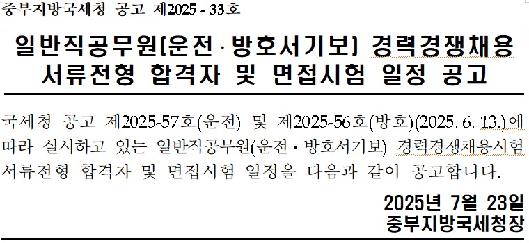 중부지방국세청 공고 제2025-33호 일반직공무원(운전․방호서기보) 경력경쟁채용 서류전형 합격자 및 면접시험 일정 공고 국세청 공고 제2025-57호(운전) 및 제2025-56호(방호)(2025.6.13.)에 따라 실시하고 있는 일반직공무원(운전․방호서기보) 경력경쟁채용시험 서류전형 합격자 및 면접시험 일정을 다음과 같이 공고합니다. 2025년 7월 23일 중부지방국세청장