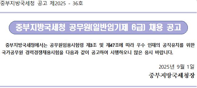 중부지방국세청 공고 제2025 - 36호 중부지방국세청 공무원(일반임기제 6급) 채용 공고 중부지방국세청에서는 공무원임용시험령 제3조 및 제47조에 따라 우수 인재의 공직유치를 위한 국가공무원 경력경쟁채용시험을 다음과 같이 공고하여 시행하오니 많은 응시 바랍니다. 2025년 9월 1일 중부지방국세청장
