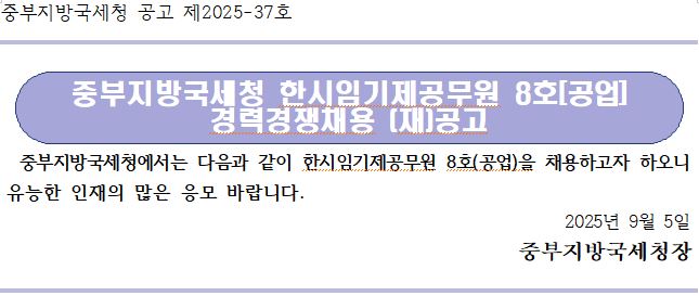 중부지방국세청 공고 제2025-37호 중부지방국세청 한시임기제공무원 8호[공업] 경력경쟁채용 (재)공고 중부지방국세청에서는 다음과 같이 한시임기제공무원 8호(공업)을 채용하고자 하오니 유능한 인재의 많은 응모 바랍니다. 2025년 9월 5일 중부지방국세청장