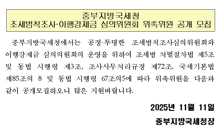 (중부청)조세범칙조사,이행강제금심의위원회 위촉위원 모집 공고문_251111.hwp