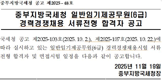 중부지방국세청 공고 제2025-48호 중부지방국세청 일반임기제공무원(6급) 경력경쟁채용 서류전형 합격자 공고 국세청 공고 제2025-103호(2025.10.2.), 제2025-107호(2025.10.22.)에 따라 실시하고 있는 일반임기제공무원(6급) 경력경쟁채용시험 서류전형 합격자 및 면접시험 일정을 다음과 같이 공고합니다. 2025년 11월 19일 중부지방국세청장