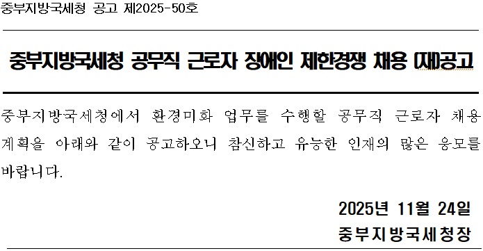 중부지방국세청 공고 제2025-50호 중부지방국세청 공무직 근로자 장애인 제한경쟁 채용 (재)공고 중부지방국세청에서 환경미화 업무를 수행할 공무직 근로자 채용 계획을 아래와 같이 공고하오니 참신하고 유능한 인재의 많은 응모를 바랍니다. 2025년 11월 24일 중부지방국세청장