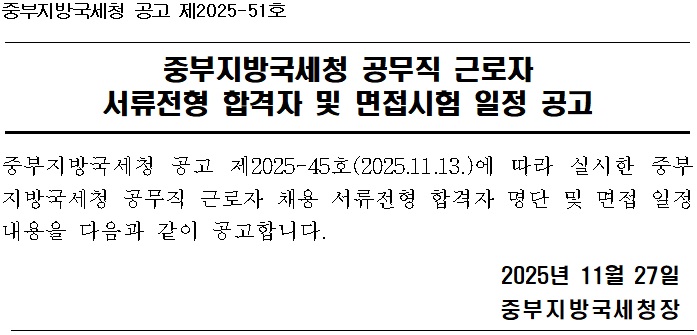 중부지방국세청 공고 제2025-51호 중부지방국세청 공무직 근로자 서류전형 합격자 및 면접시험 일정 공고 중부지방국세청 공고 제2025-45호(2025.11.13.)에 따라 실시한 중부지방국세청 공무직 근로자 채용 서류전형 합격자 명단 및 면접 일정 내용을 다음과 같이 공고합니다. 2025년 11월 27일 중부지방국세청장