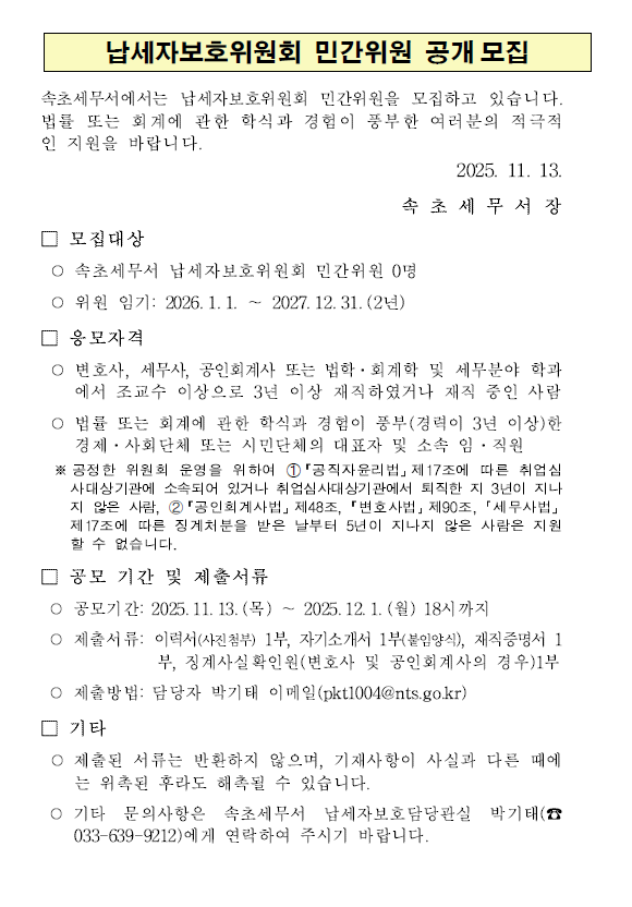 속초세무서 납세자보호위원회 민간위원 공개 모집